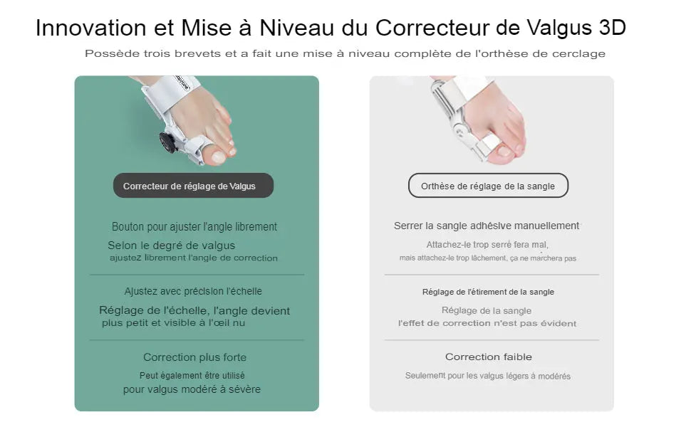 • Un dispositif efficace pour réaligner et soulager les oignons douloureux, les orteils en marteau et l’hallux valgus